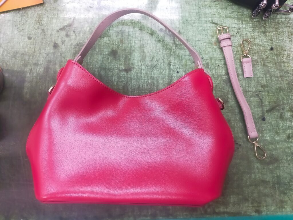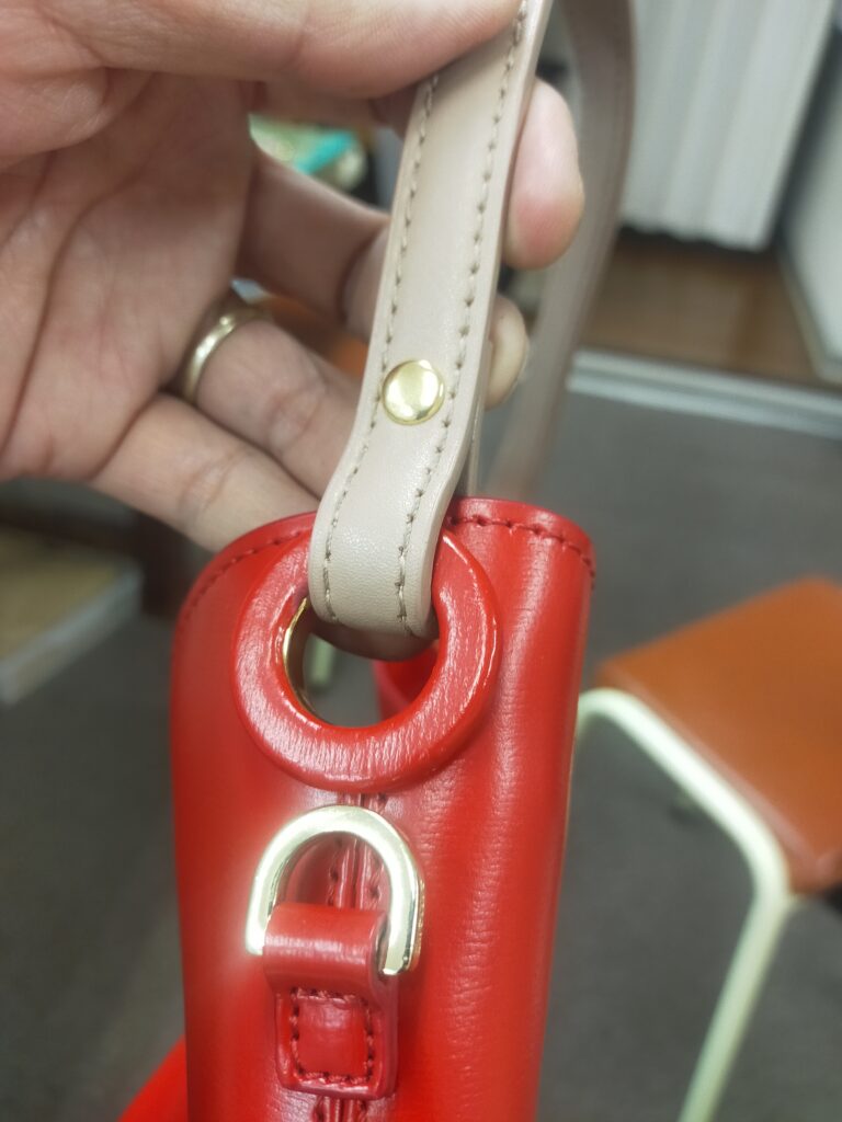 ショルダーベルトを切って、持ち手ベルトにしました。